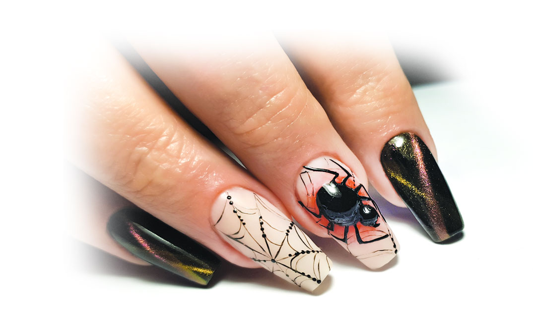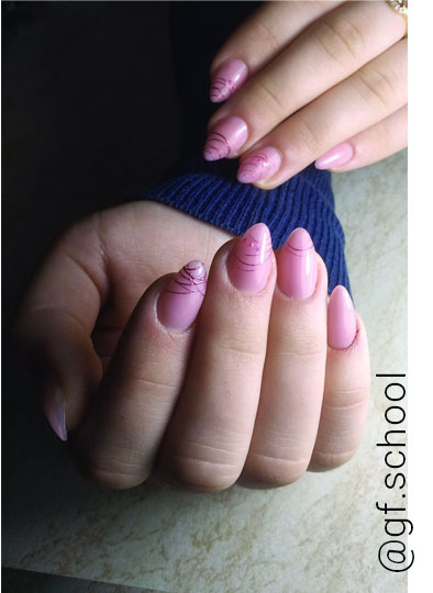 У паутинки очень широкий спектр использования. Варианты дизайна с гелем “паутинкой” можно придумать очень разные, но самые популярные – это абстрактный узор из тонких ниточек и геометрия. Разнообразить дизайн всегда можно, добавив декор поверх “паутинки” (стразы, заклёпки, объёмные украшения) или же под неё на фон (камифубики, фольга и т.п.). Можно нарисовать линии любой формы: прямые, полукруглые, изогнутые, угловые и другие.