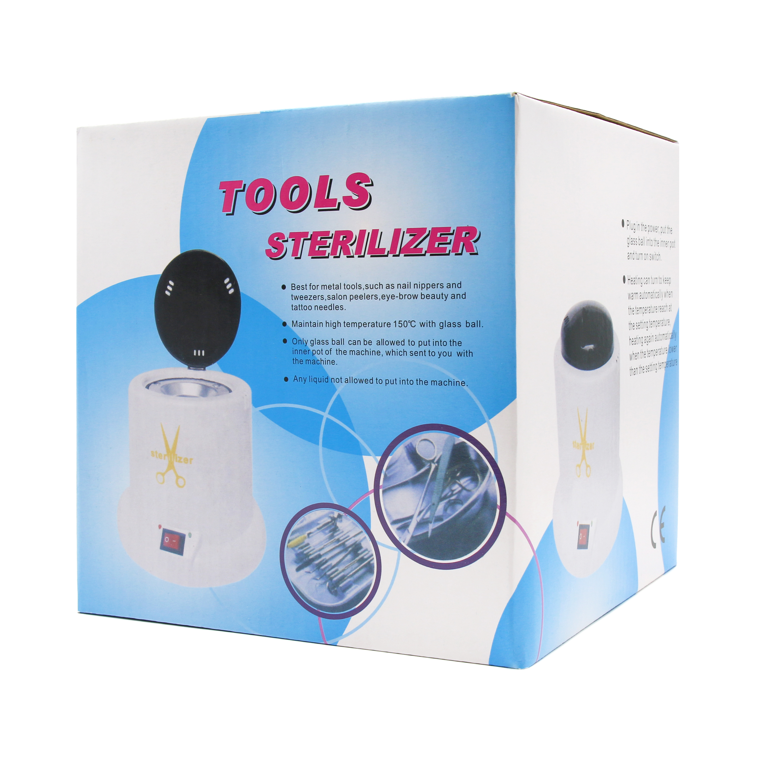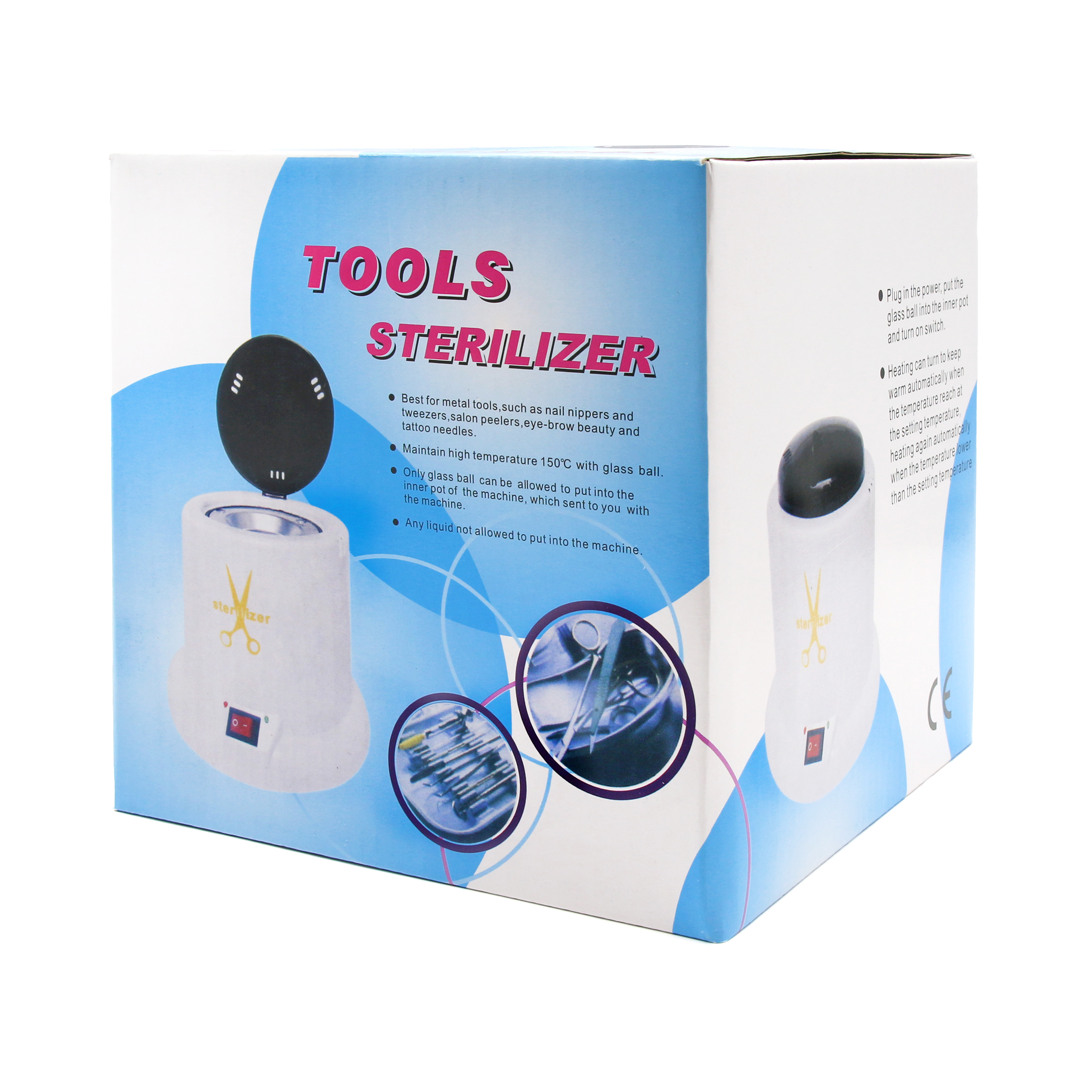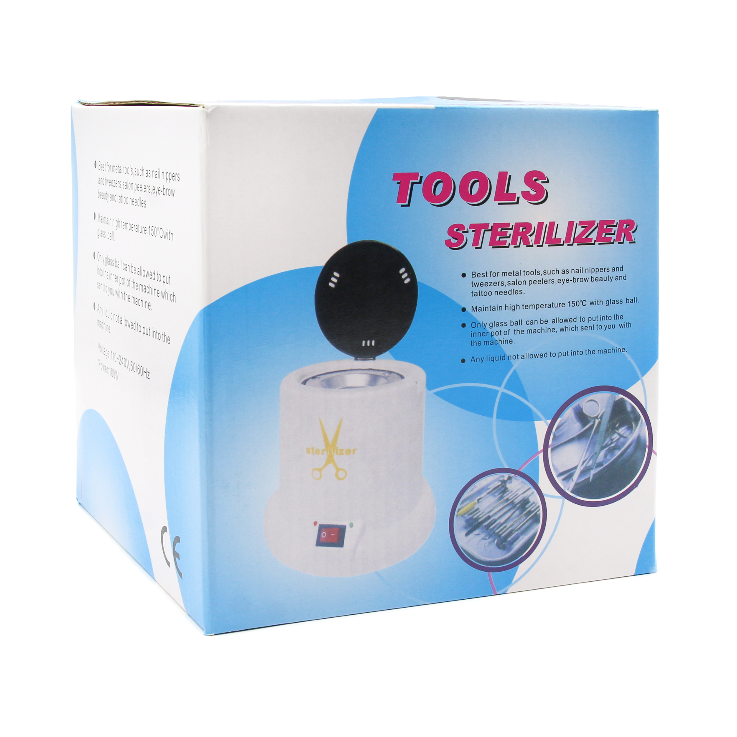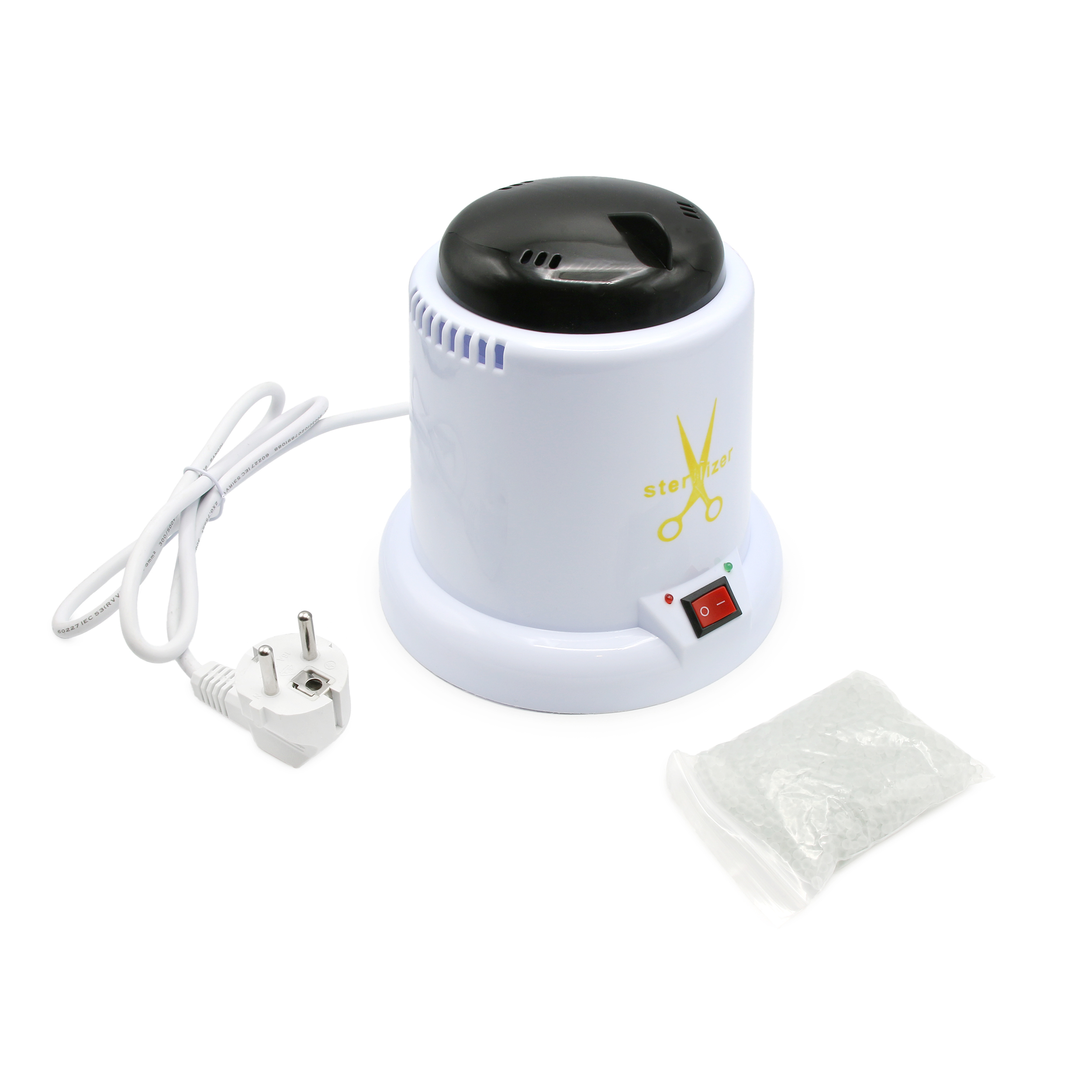Если стерилизатор используется в салоне, он может быть включён на протяжении всего рабочего дня. Перед стерилизацией инструменты должны быть тщательно очищены и продезинфицированы специальным раствором. Как правильно дезинфицировать инструмент, вы можете узнать из методических указаний к препарату, который вы используете. После этого инструменты должны обсохнуть. Во избежание коррозии инструментов помещать мокрый инструментарий в шариковый стерилизатор не рекомендуется. Стерилизация инструментов производится в течение очень короткого времени – не более 20 секунд. Более длительное воздействие высокой температуры приводит к затуплению инструментов. Корпус белого цвета. Мощность аппарата: 100 Вт. Параметры маленького стерилизатора: диаметр нижней части 16 см, высота 17 см, вес с шариками – 720 грамм. Параметры большого стерилизатора: диаметр нижней части 16 см, высота 20 см, вес с шариками – 785 грамм. Важно знать, что со временем пар теряет хорошую тепло проводимость и уже не может нагревать до температуры 250 градусов. Именно поэтому рекомендуется раз в полгода полностью менять начинку: кварцевые шарики, которые можно приобрести отдельно.