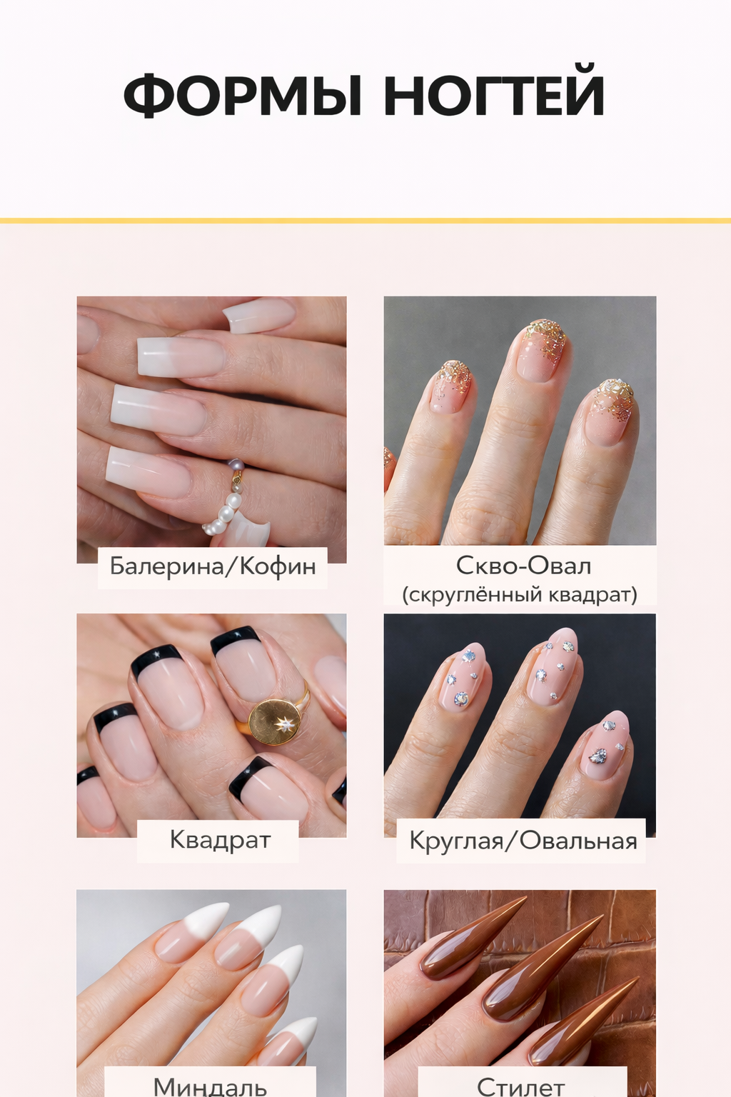 Не знаете, какая форма ногтей вам идеально подойдёт? Мы поможем разобраться! Узнайте о самых популярных формах, кому они подходят и как правильно оформить их с помощью пилочки. Читайте дальше наш новый материал и откройте для себя 9 популярных форм ногтей, которые стоит попробовать каждой любительнице красивого маникюра. .