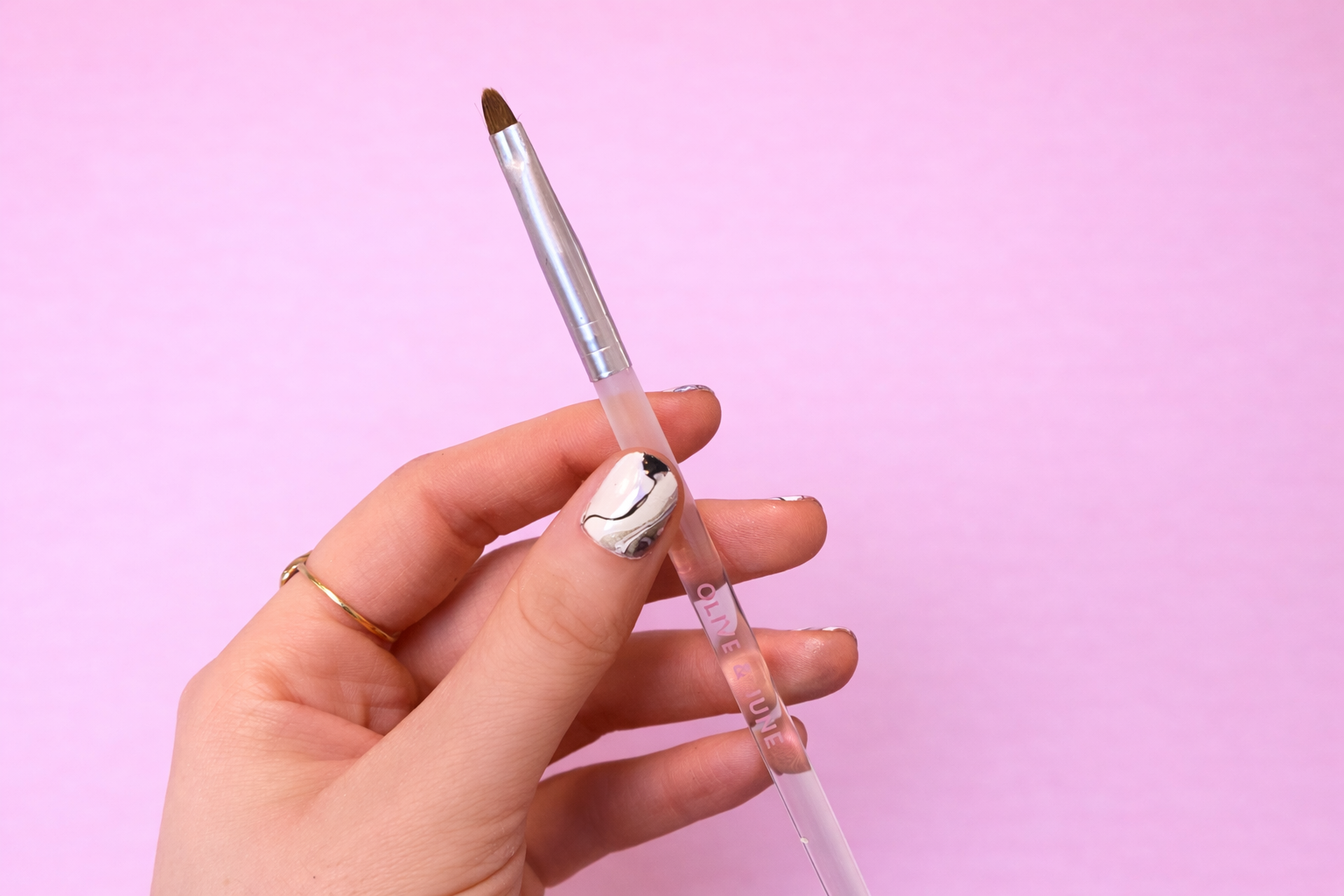 Поскольку процесс может получиться довольно «грязным», рекомендуем использовать ватную палочку для удаления лишнего лака с кожи, а кисть для очистки — для более точной и аккуратной проработки зоны кутикулы и боковых валиков.