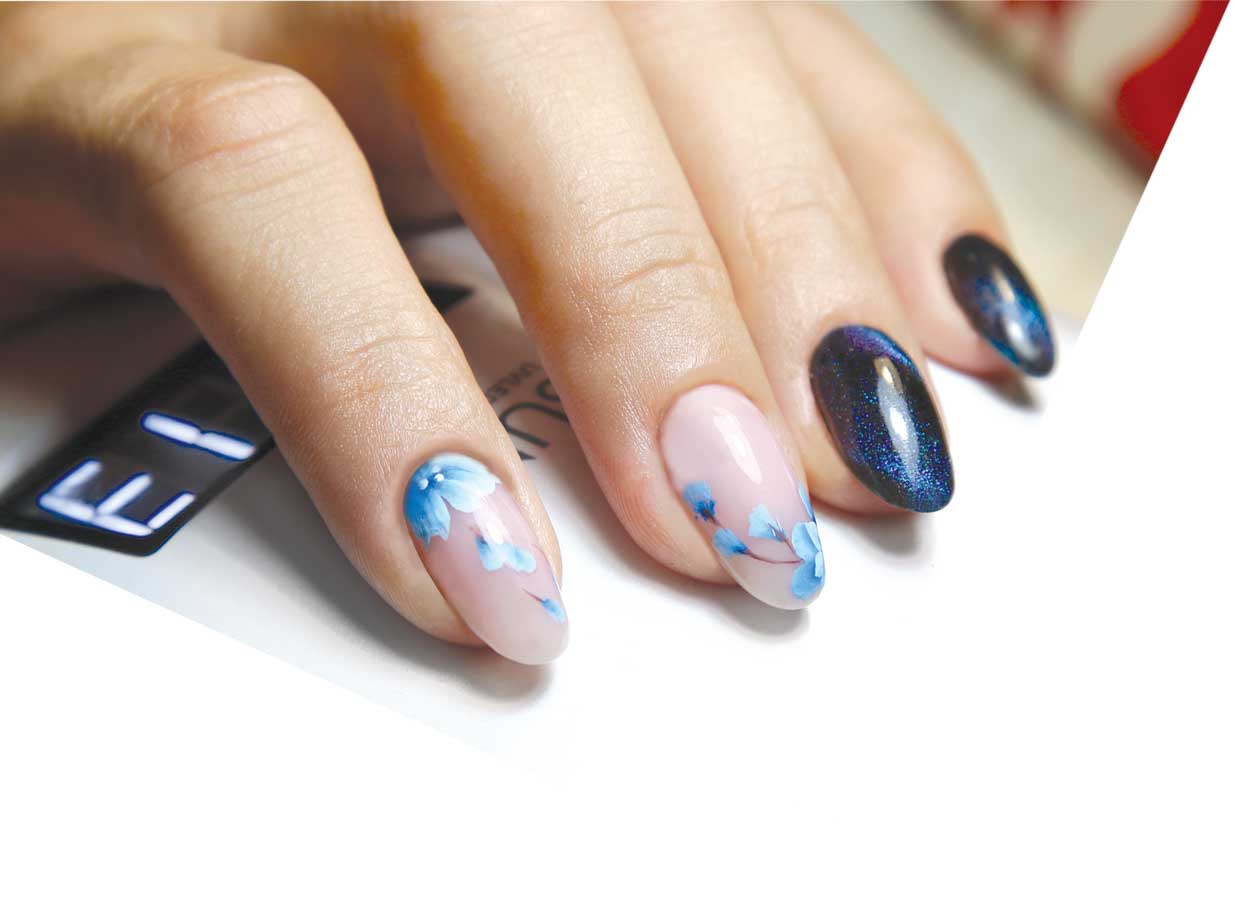 Apply gel Polish Cat eye, with a magnet to create the desired design, cure under UV lamp.