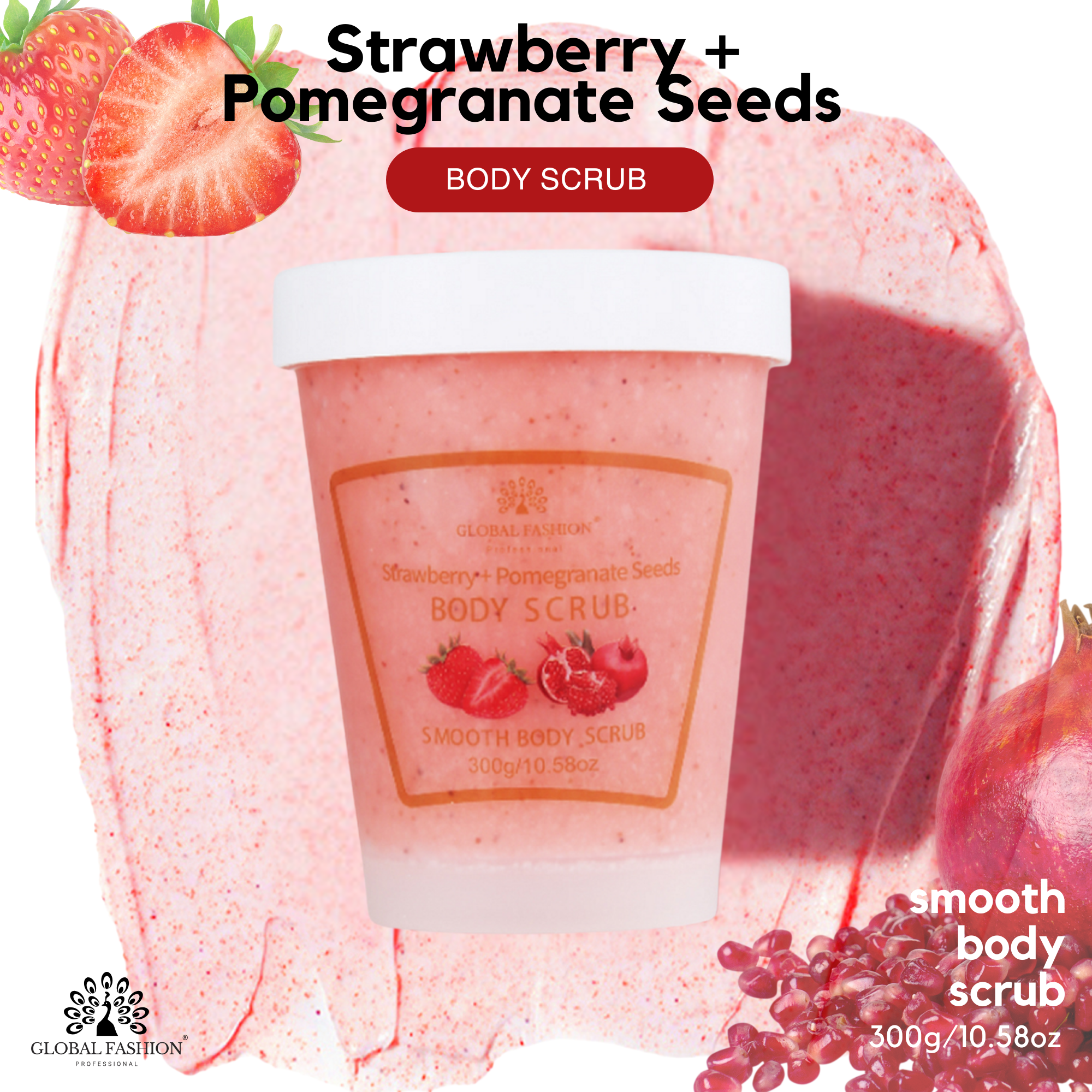 Ideal for: Anyone who desires velvety, refreshed, and beautifully scented skin. Global Fashion Body Scrub with Strawberry & Pomegranate, 300 g — complete care for your skin!