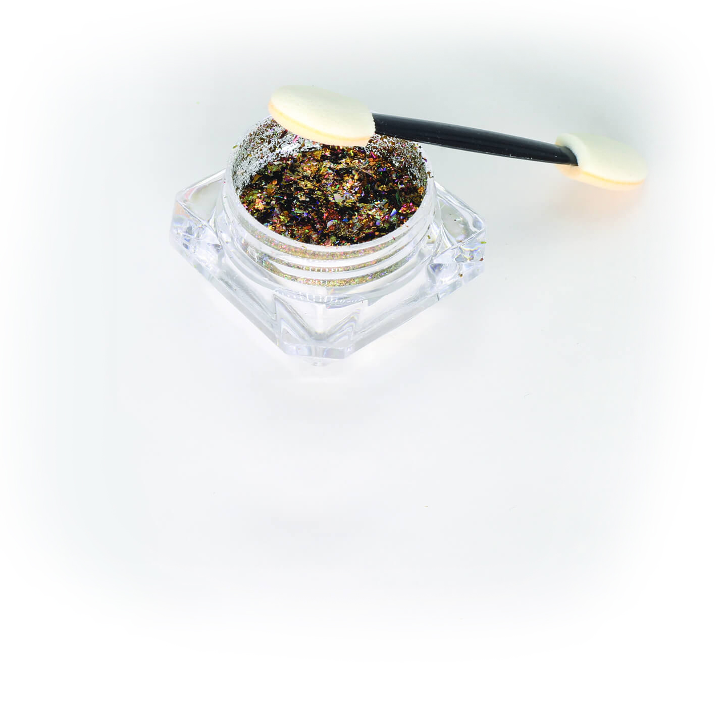 Finely dispersed foil, shimmering in different colors.