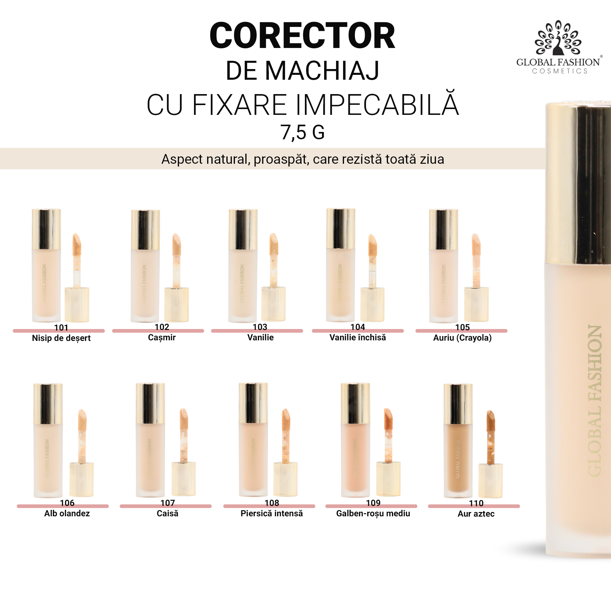 Corectorul Global Fashion #102 este conceput pentru a uniformiza tonul pielii și pentru a ascunde eficient imperfecțiunile, fără a încărca tenul. Textura sa fină și cremoasă se aplică ușor, se estompează natural și oferă un aspect luminos și îngrijit pe tot parcursul zilei.