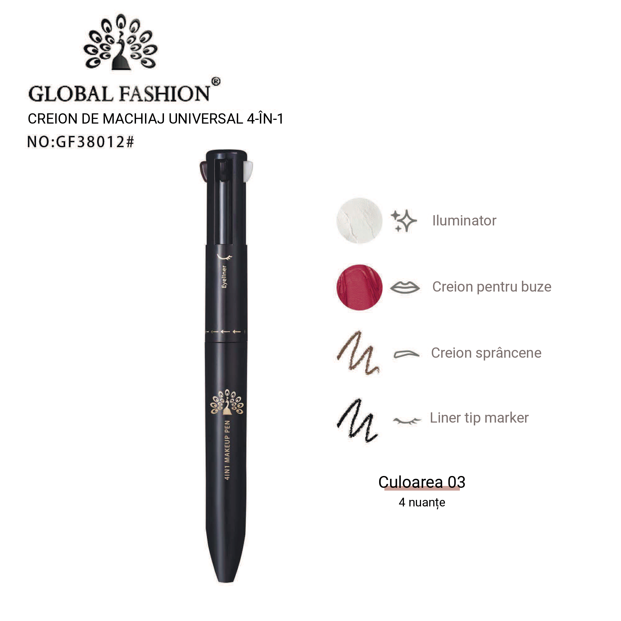 💎 Global Fashion Creion de machiaj 4 în 1 GF38012 #03 – versatilitate, precizie și eleganță într-un singur instrument de înfrumusețare.
