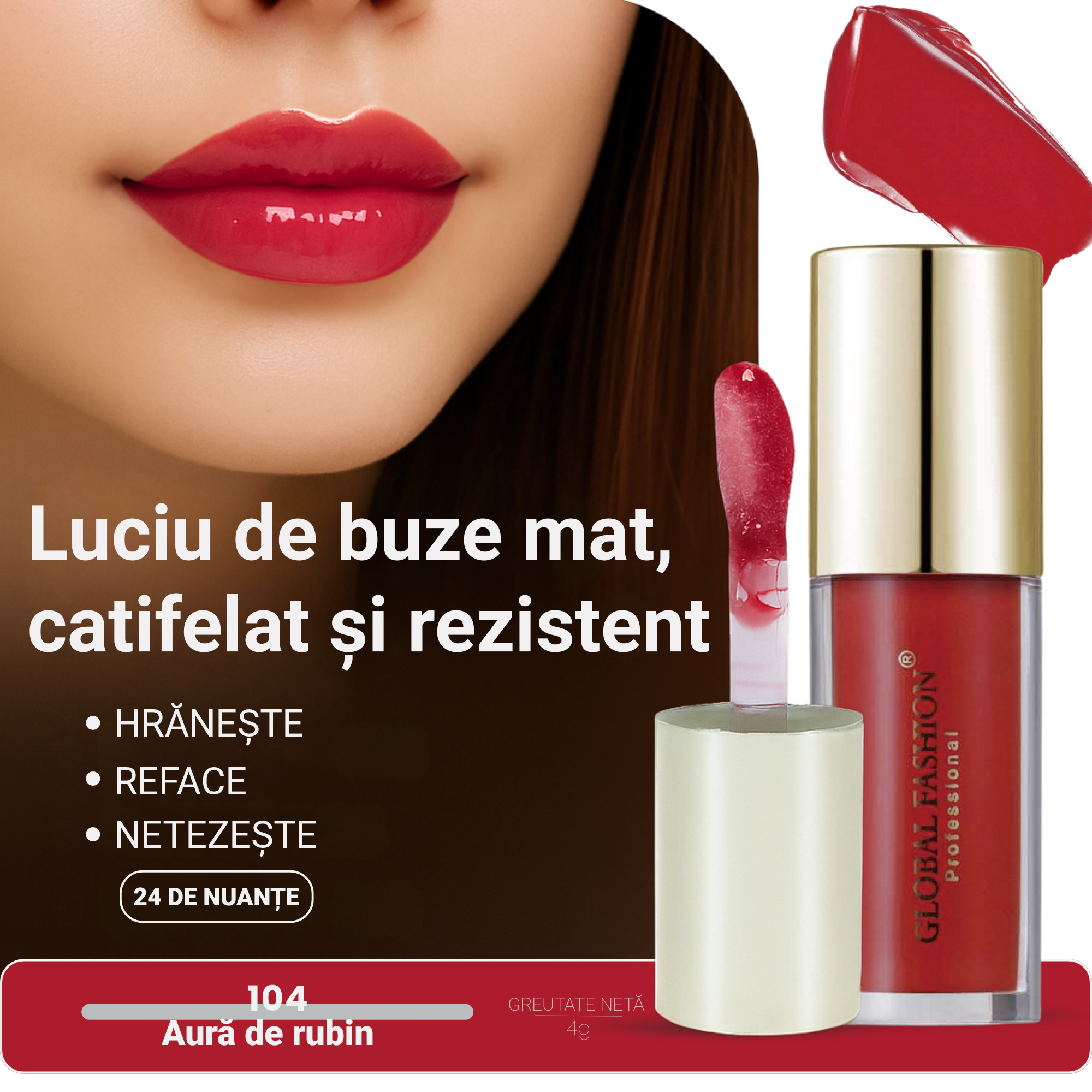 Luciu de buze mat și rezistent, Global Fashion, #104 – Delicatețe și feminitate în fiecare aplicare
