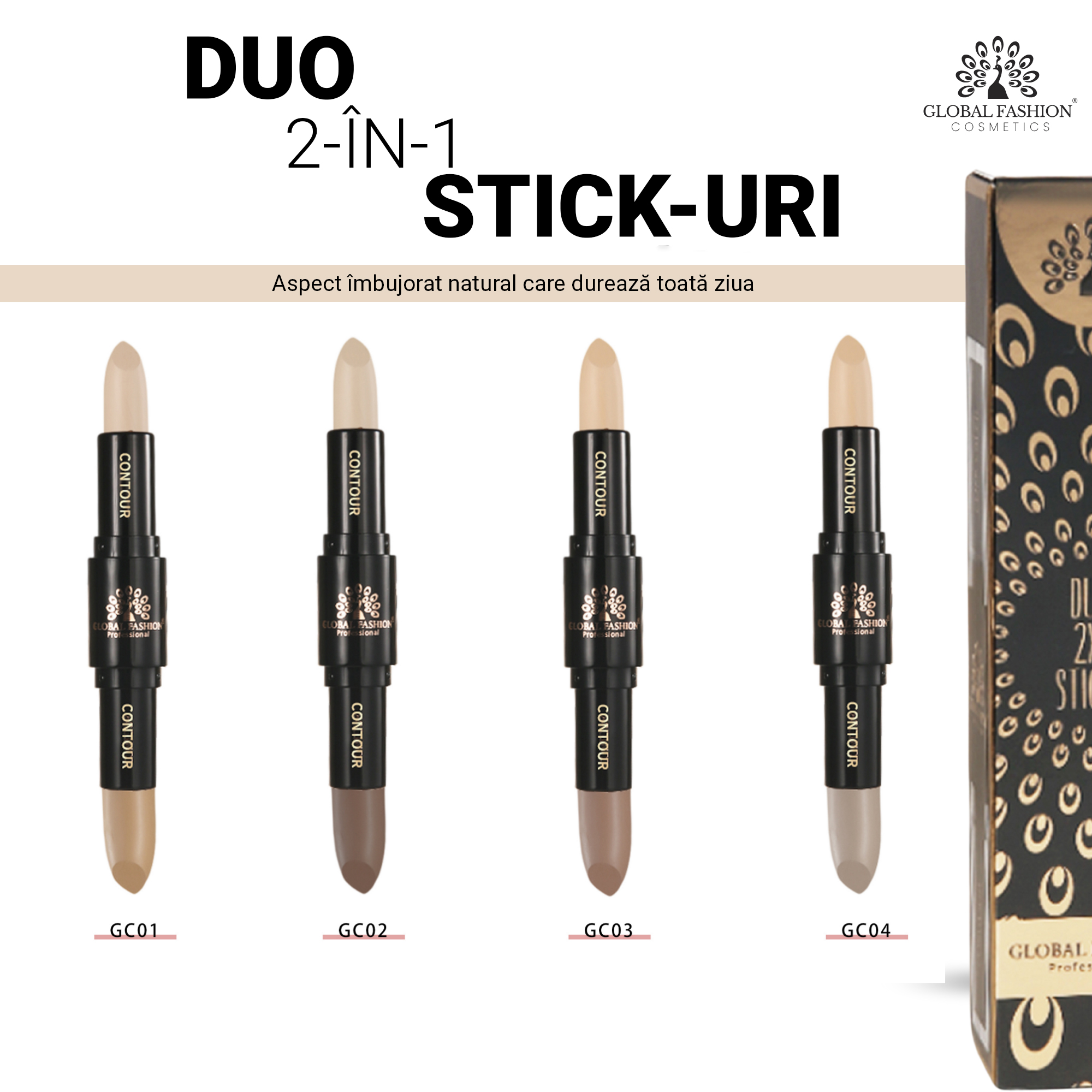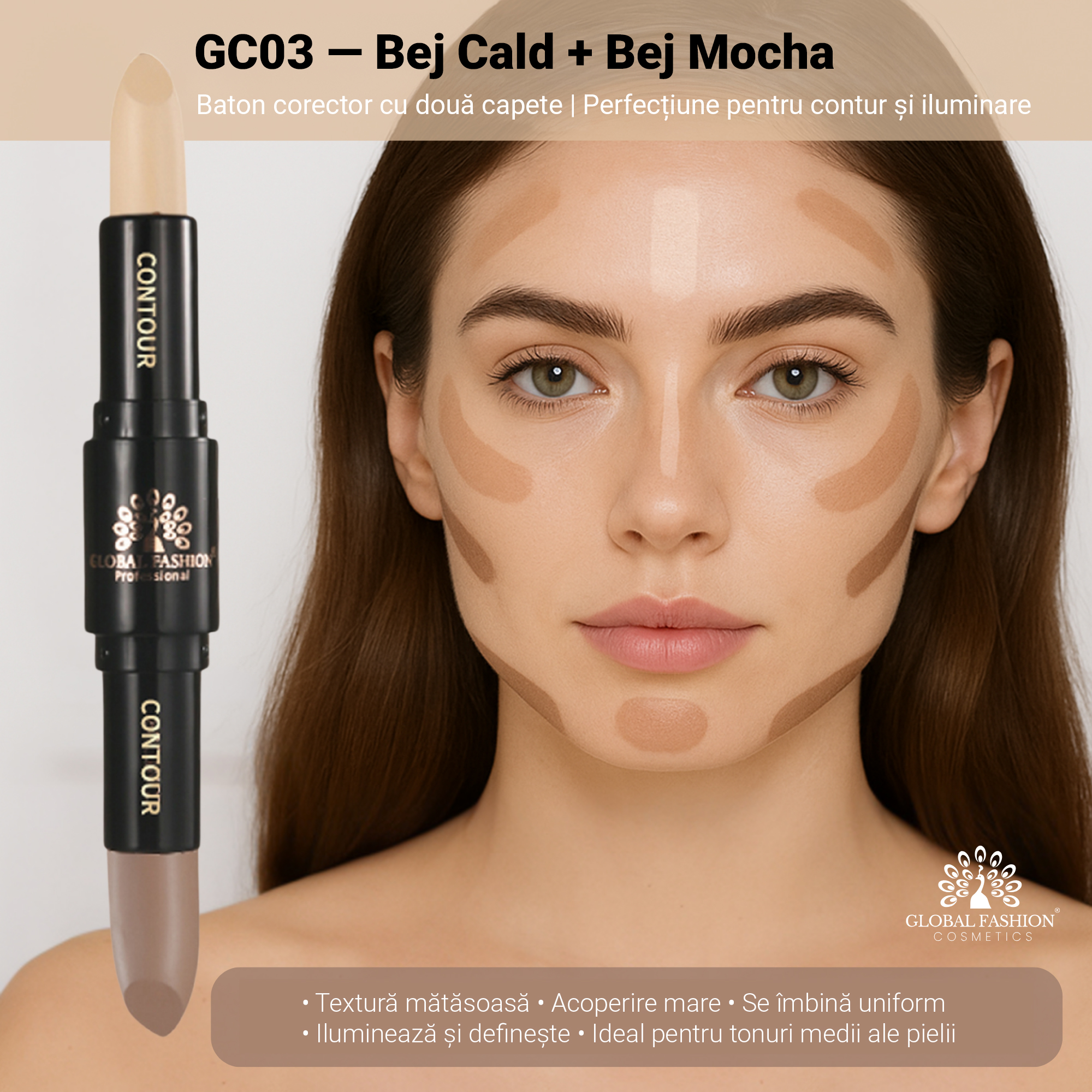 Stick Duo 2în1 Global Fashion GC03 – Corector + Concealer pentru un ten natural, luminos și uniform
